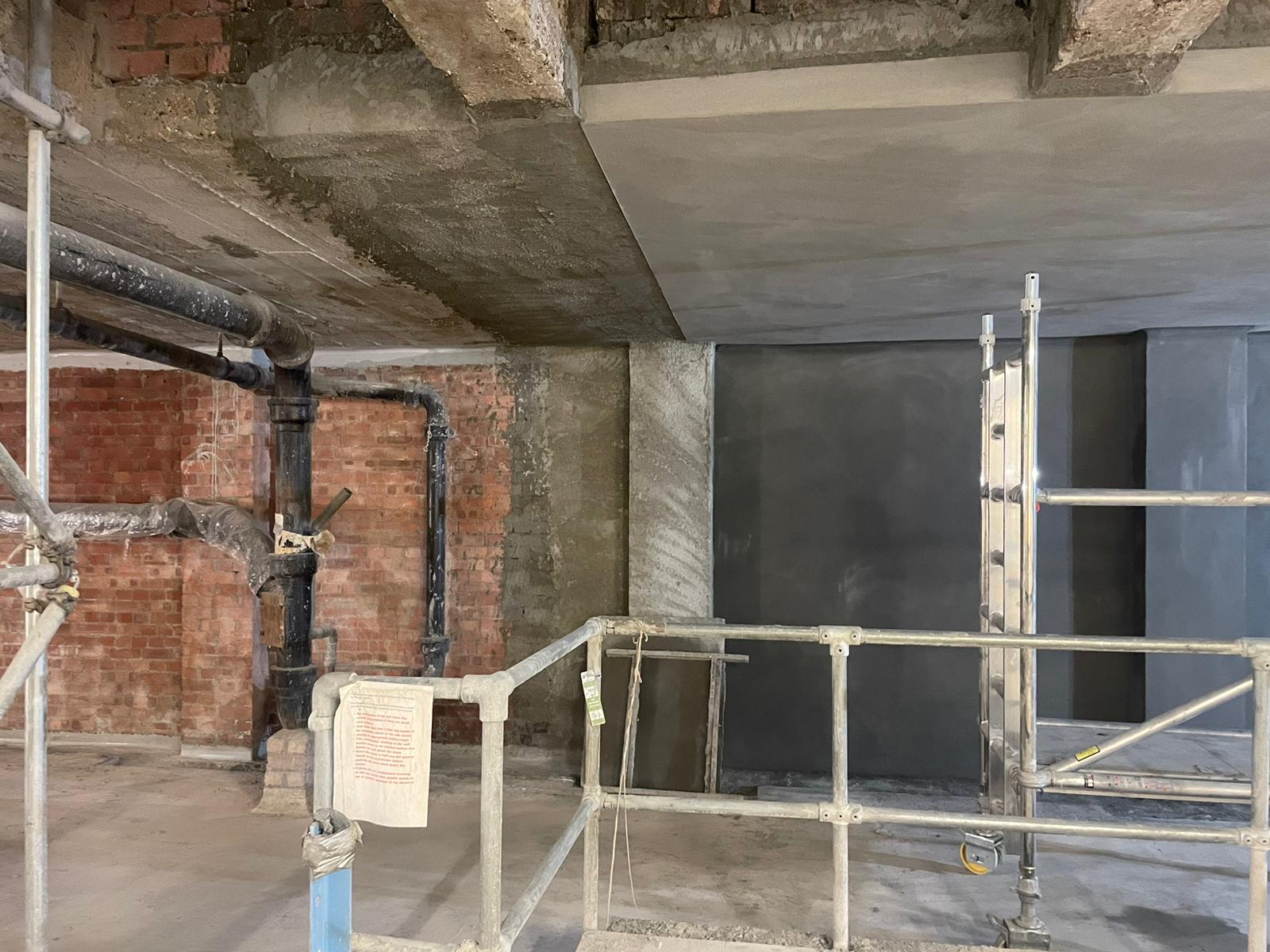 Existing redundant retail basement spaces were suffering damp & water ingress through existing brick & concrete retaining walls. Furthermore, with a number. of the basement areas partially directly underneath pavement lights, water was seeping in from above through failed waterproofing measures previously applied.