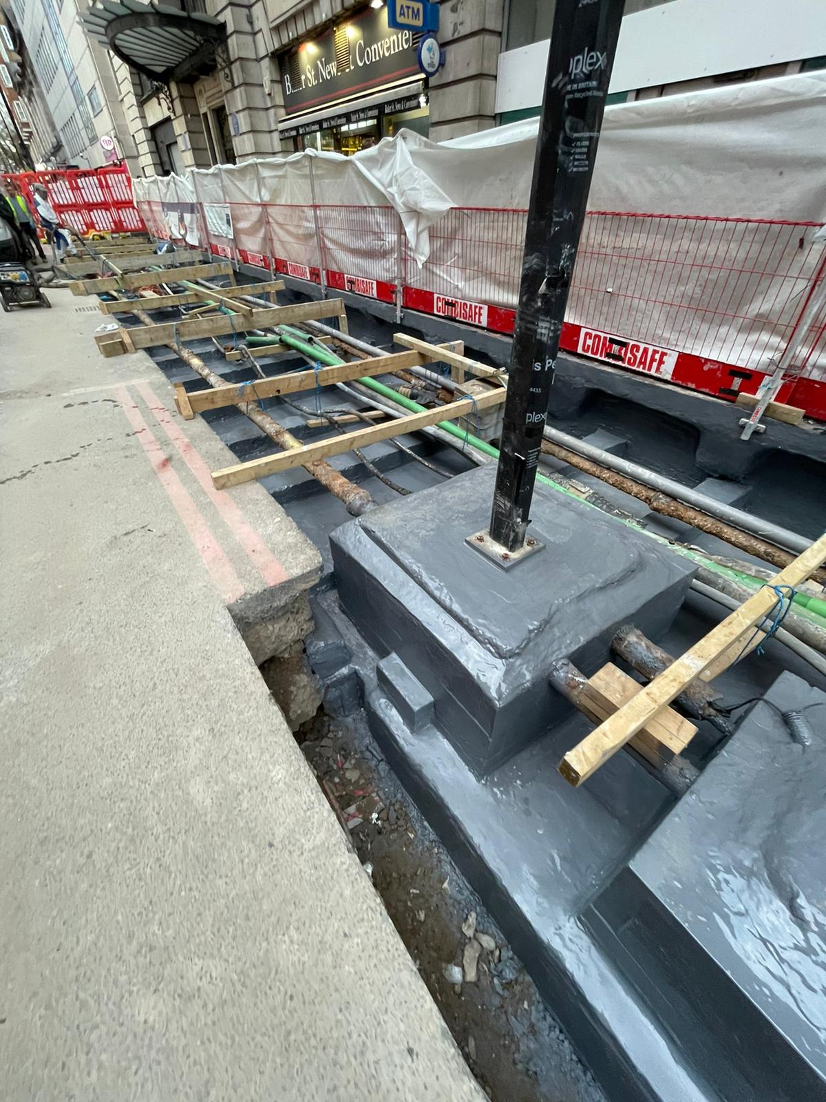 Externally, approx. 650m2 of podium waterproofing around the existing pavement lights was installed to prevent the ingress of external groundwater prior to pavement reinstatement.